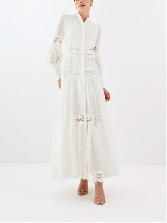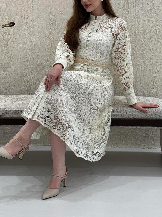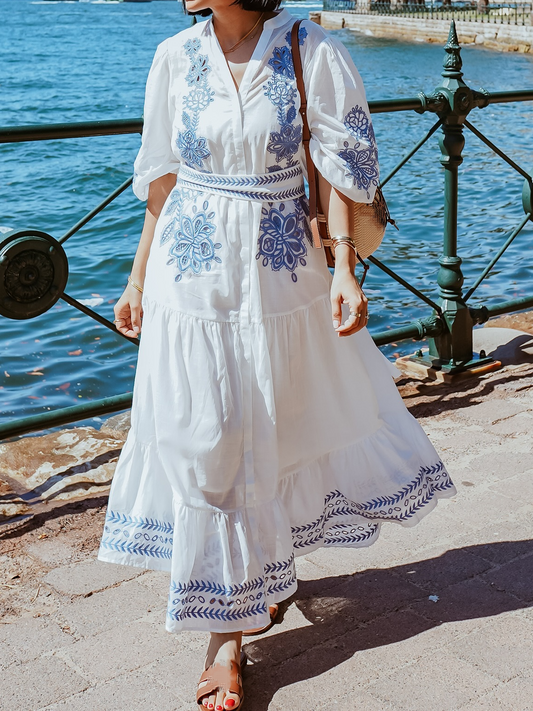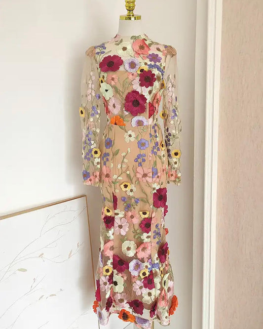 Long Sleves Floral Embroidery Fishtail Midi Dress